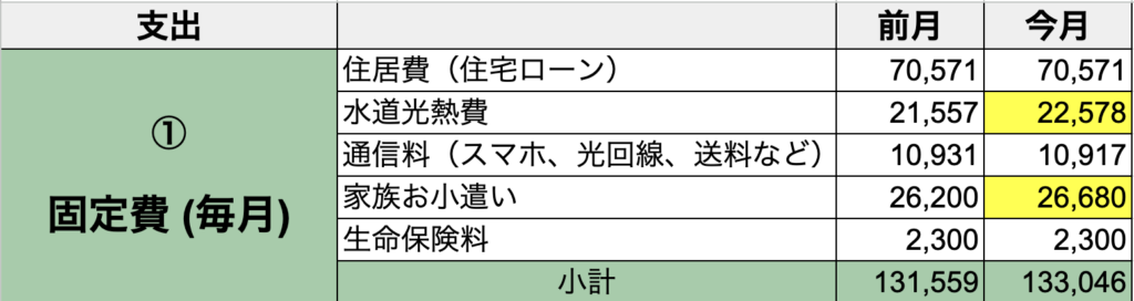 ①固定費(毎月):毎月ほぼ一定でかかる支出(住宅ローン、保険、通信費など)