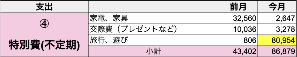④特別費(不定期):季節イベントや突発的な支出(旅行、冠婚葬祭、家電購入など)