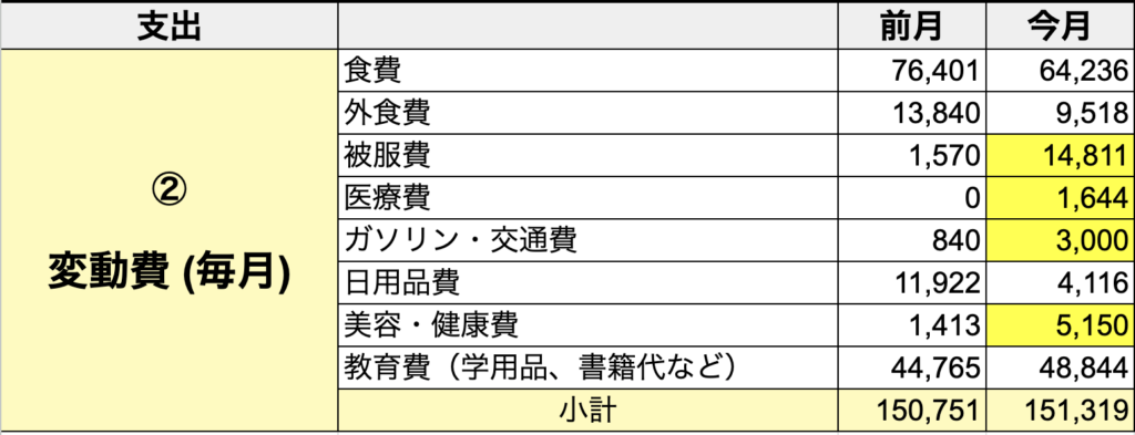 ②変動費(毎月):月によって変わる支出(食費、日用品、交通費など)
