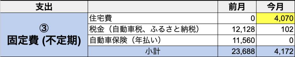 ③固定費(不定期):毎月ではないが、一定でかかる支出(固定資産税、年会費など)