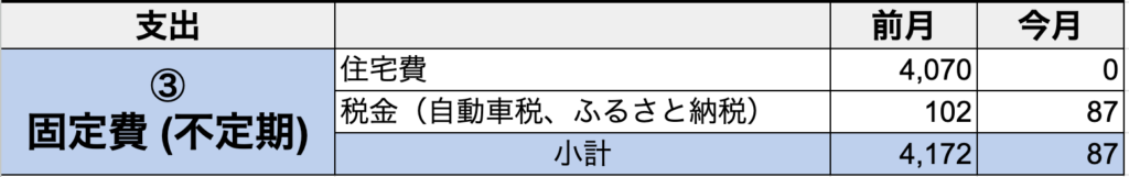 ③固定費(不定期):毎月ではないが、一定でかかる支出(固定資産税、年会費など)