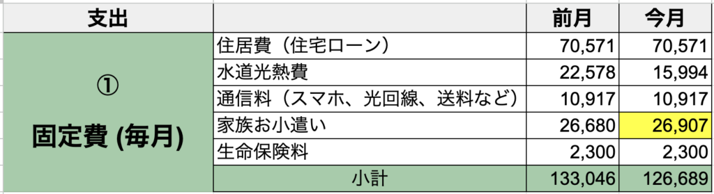 ①固定費(毎月):毎月ほぼ一定でかかる支出(住宅ローン、保険、通信費など)