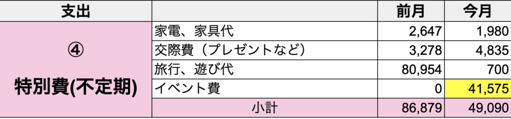 ④特別費(不定期):季節イベントや突発的な支出(旅行、冠婚葬祭、家電購入など)