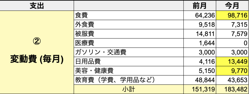②変動費(毎月):月によって変わる支出(食費、日用品、交通費など)