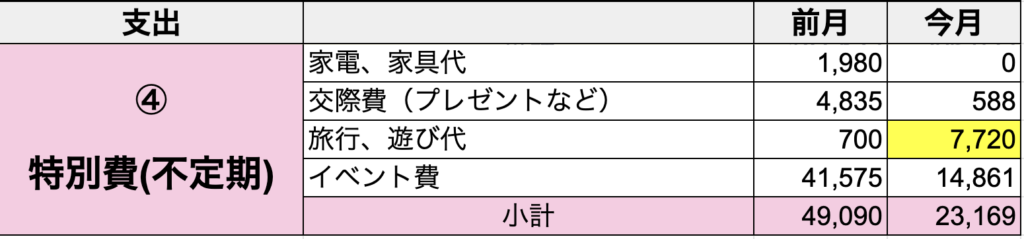 ④特別費(不定期):季節イベントや突発的な支出(旅行、冠婚葬祭、家電購入など)