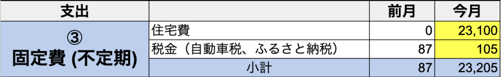 ③固定費(不定期):毎月ではないが、一定でかかる支出(固定資産税、年会費など)