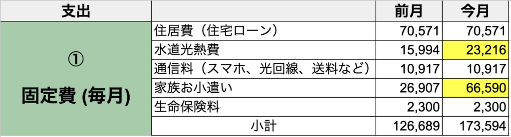 ①固定費(毎月):毎月ほぼ一定でかかる支出(住宅ローン、保険、通信費など)